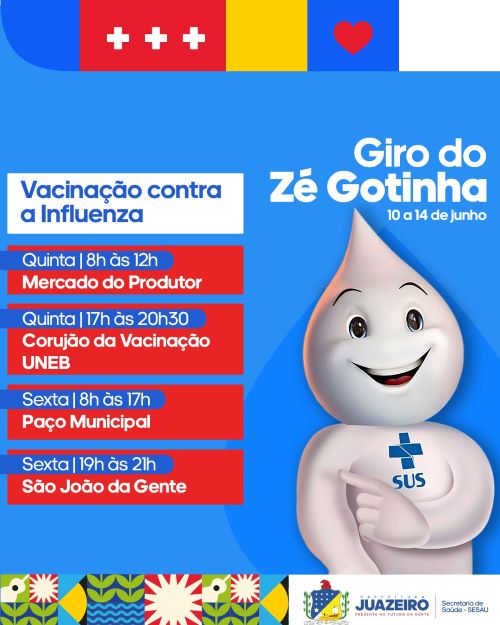 A Secretaria de Saúde de Juazeiro/Sesau informa à população sobre a programação de vacinação contra a Influenza durante o Giro Zé Gotinha. A ação visa ampliar a cobertura vacinal no município, facilitando o acesso da população à imunização.
