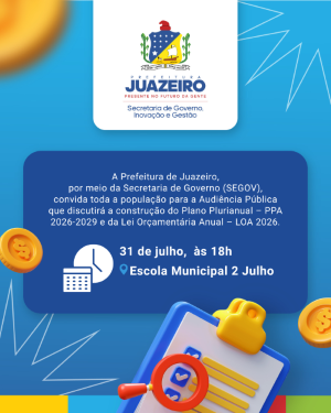 A Prefeitura de Juazeiro realiza nesta quarta-feira (30), às 18h, no distrito de Maniçoba, a primeira audiência pública descentralizada para discutir a elaboração da Lei Orçamentária Anual (LOA) e do Plano Plurianual (PPA). O encontro será na Escola Municipal 2 de Julho, e contará com a presença de técnicos da gestão que irão explicar à população como esses instrumentos funcionam e de que forma impactam diretamente no futuro da cidade.