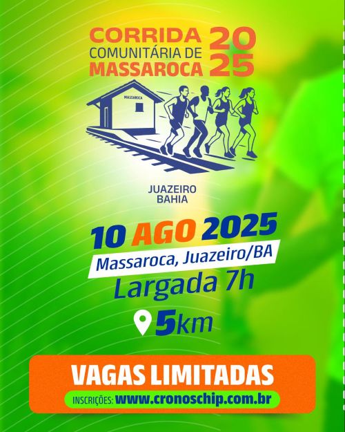 A comunidade de Massaroca vai sediar a sua primeira corrida comunitária, com apoio da prefeitura de Juazeiro. O evento terá largada às 7h da manhã e vai oferecer diferentes categorias para públicos de todas as idades, com percursos de 5 km, 3 km (caminhada), 1 km (para crianças de 12 a 13 anos) e 400 metros (para crianças de 10 a 11 anos).