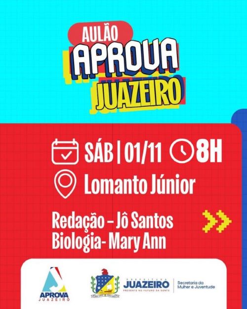 A Prefeitura de Juazeiro, por meio da Secretaria da Mulher e Juventude/SMJ), está com inscrições abertas para o segundo ciclo de aulões do programa Aprova Juazeiro, que será realizado neste sábado, 1º de novembro, no Colégio Lomanto Júnior, localizado na Rodovia Lomanto Júnior, Km 3 – s/n, Castelo Branco, das 8h às 12h.