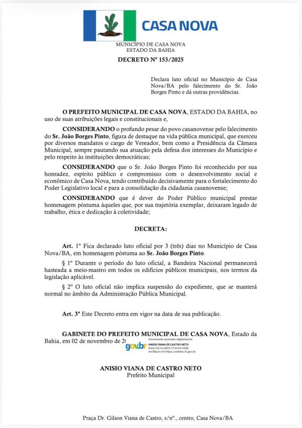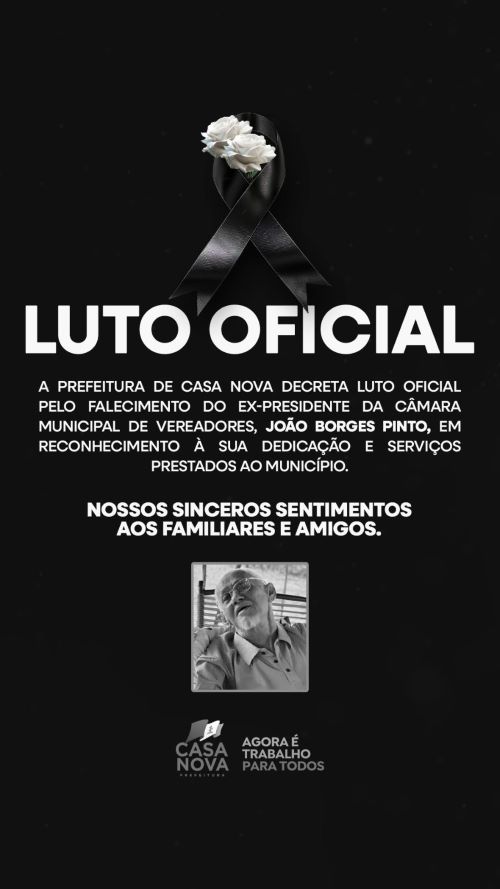 A Prefeitura de Casa Nova lamenta profundamente o falecimento de João Borges Pinto, ex-vereador, ex-presidente da Câmara Municipal e pai do atual presidente da Casa Legislativa. Reconhecido por sua trajetória de dedicação à vida pública e pelos relevantes serviços prestados ao município, João Borges Pinto deixa um legado de compromisso e respeito à comunidade casanovense.