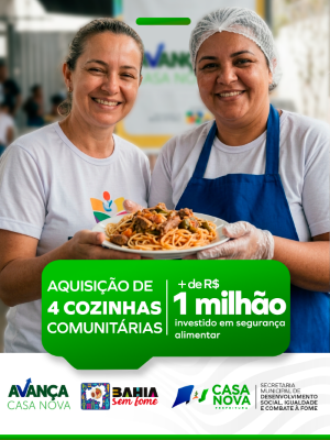 O município de Casa Nova segue avançando nas políticas de cuidado social. Foi publicado o convênio nº 85/2026, que assegura a implantação de 04 cozinhas comunitárias, fruto da parceria com o Governo do Estado, por meio do Programa Bahia Sem Fome. A iniciativa vai garantir a oferta de 800 refeições diárias para a população em situação de vulnerabilidade.