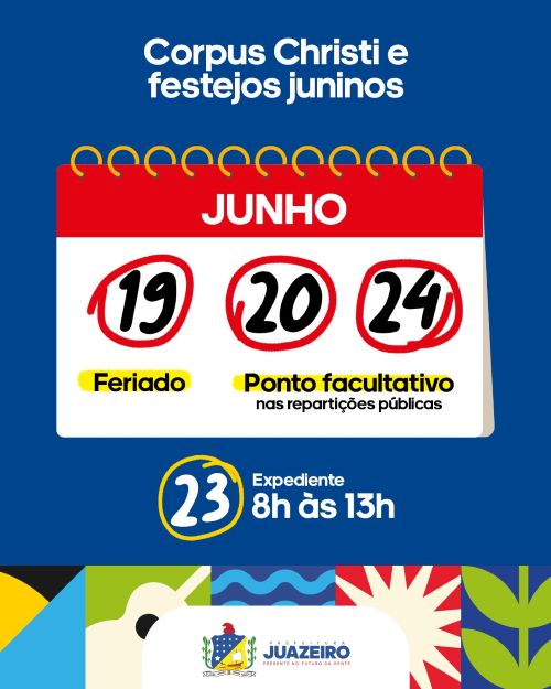A Prefeitura de Juazeiro informa que, em virtude dos feriados de Corpus Christi (19 de junho) e São João (24 de junho), o expediente nas repartições públicas municipais será alterado. Conforme estabelecido pelas portarias nº 138/2025 e nº 139/2025, o ponto facultativo se estenderá também para os dias 20 e 24 de junho. No dia 23, véspera de São João, o expediente será reduzido, funcionando das 8h às 13h em toda a Administração Direta, Indireta e Autárquica.