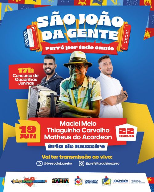 O encerramento do Concurso de Quadrilhas de Juazeiro, nesta quinta-feira (19), vai contar com uma programação especial de shows na Orla da cidade. Após as apresentações dos grupos juninos, que iniciam às 17h, o público poderá curtir shows gratuitos de Maciel Melo, Tiaguinho Carvalho e Matheus do Acordeon. Os artistas sobem ao palco a partir das 22h, embalando a festa promovida pela Secretaria de Cultura, Turismo e Esportes/Seculte.
