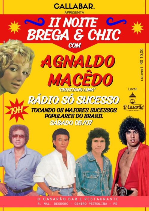No próximo sábado (5), a partir das 19h, acontece a segunda edição da Noite Brega e Chique, um show repleto de música, interação e diversão. Cristiano Limatraz, ator e cantor, apresenta seu personagem Agnaldo Macedo em um espetáculo que revive grandes sucessos populares que marcaram gerações. O formato simula uma rádio ao vivo, onde o público pode conversar, pedir músicas e participar diretamente da apresentação, tornando a noite ainda mais animada e única. O evento será realizado no O Casarão bar e restaurante, localizado na Rua Marechal Deodoro, nº 969, Centro, Petrolina. A entrada é gratuita, com cobrança de couvert artístico no valor de R$ 10,00.