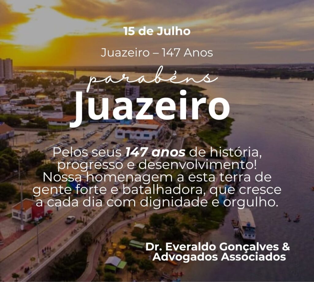 Parabéns Juazeiro! Cidades Juazeiro 15 de julho de 202515 de julho de 2025Luiz Washington Mensagem de Dr. Everaldo Gonçalves e Advogados Associados a Juazeiro pelo aniversários de 147 anos de Emancipação Política! Compartilhe isso: Compartilhar no Facebook(abre em nova janela) Facebook Compartilhar no WhatsApp(abre em nova janela) WhatsApp Compartilhar no Telegram(abre em nova janela) Telegram
