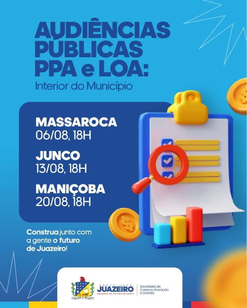 A Prefeitura de Juazeiro está levando as audiências públicas para os distritos, aproximando o planejamento do município da população. Nesta quarta-feira (13), às 18h, a Escola Manoel Amorim, no Junco, será palco para o diálogo sobre o Plano Plurianual (PPA) 2026–2029 e a Lei Orçamentária Anual (LOA) de 2026.