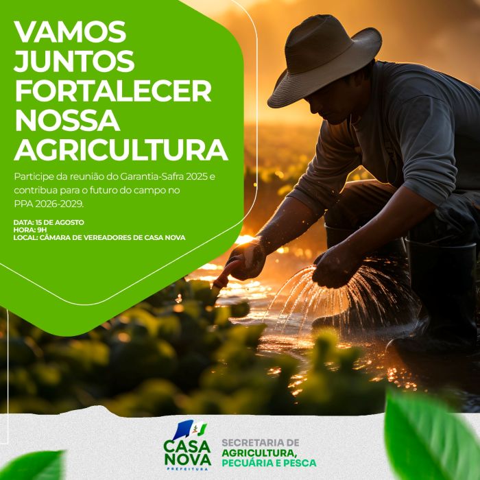 A Prefeitura de Casa Nova, por meio da Secretaria de Agricultura, Pecuária e Pesca, realiza na próxima sexta-feira (15), às 9h, na Câmara de Vereadores, um encontro com presidentes e representantes de associações rurais do município. O objetivo é alinhar estratégias para facilitar as inscrições de agricultores familiares no programa Garantia Safra 2025.