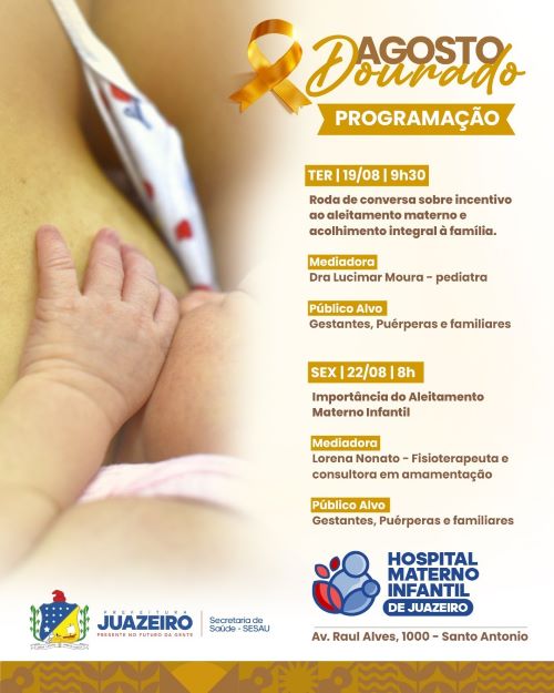A Secretaria de Saúde de Juazeiro realizará a programação oficial do Hospital Materno Infantil (HMI) em alusão à campanha Agosto Dourado, que simboliza a luta pelo incentivo à amamentação. Com o tema central voltado à valorização do aleitamento materno e ao acolhimento da família, o hospital promoverá dois encontros informativos e acolhedores voltados a gestantes, puérperas e seus familiares.