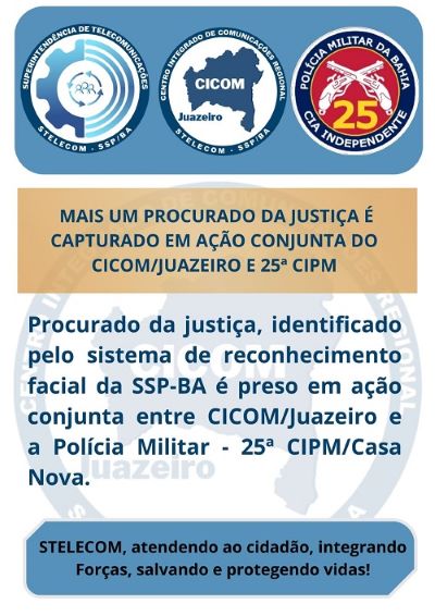 O acionamento deu-se via CICOM/Juazeiro, onde o suspeito, procurado da justiça estava em via pública da referida urbe e diante da veracidade dos fatos foi conduzido e apresentado a Delegacia de Polícia para adoção das medidas legais. O uso da tecnologia tem auxiliado as ações das forças de segurança em todo Estado.