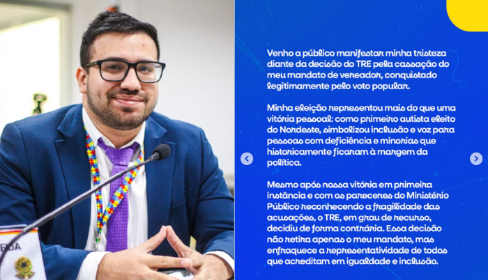 Com a decisão que cassa o seu mandato, Renan Fonseca usou o seu perfil nas redes sociais e emitiu uma nota de esclarecimento.”Independentemente do que aconteça, seguirei firme na minha missão: promover a inclusão, para que todas as pessoas sejam valorizadas, tenham justiça e oportunidades com equidade! Eu luto. Eu trabalho. Eu cuido. Eu acredito!”, diz a legenda da publicação.