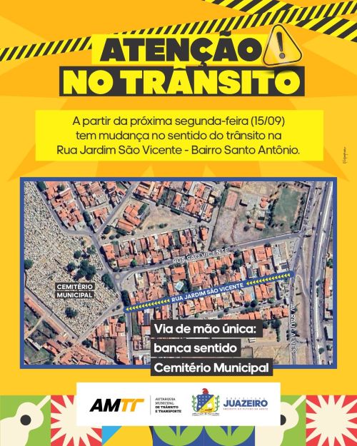 A Prefeitura de Juazeiro, por meio da Autarquia Municipal de Trânsito e Transportes (AMTT), anunciou alterações no tráfego da Rua Jardim São Vicente, antiga Rua Setenta e Cinco, no cruzamento com a Avenida Raul Alves, no bairro Santo Antônio. O objetivo é melhorar a fluidez e aumentar a segurança no trânsito da região. As mudanças entram em vigor nesta segunda-feira (15).