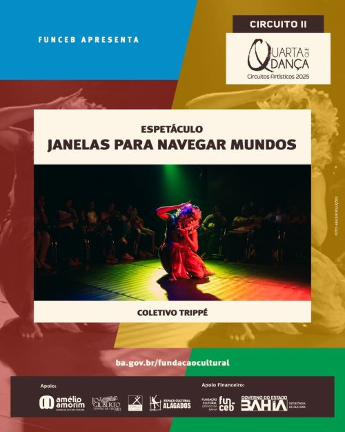O Coletivo Trippé está na programação do projeto Quarta que Dança 2025, com apresentações gratuitas do espetáculo “Janelas Para Navegar Mundos” em três municípios baianos. Após a estreia da temporada em Salvador, o espetáculo segue nesta quarta-feira (17) para Juazeiro, com sessão no Centro de Cultura João Gilberto, às 19h. Promovida pela Fundação Cultural do Estado da Bahia (Funceb/SecultBA), a iniciativa volta a ser realizada após 10 anos de pausa e busca fortalecer o encontro e articulação da rede criativa da dança baiana.