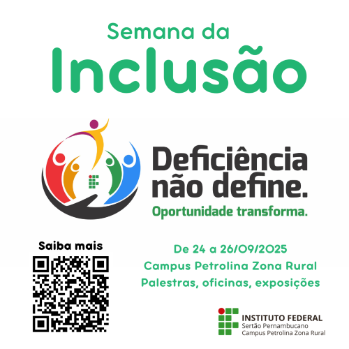 O campus Petrolina Zona Rural do IFSertãoPE realiza, entre os dias 24 e 26 de setembro, a Semana da Inclusão. Com o tema “Deficiência não define. Oportunidade transforma”, o evento é organizado pelo Núcleo de Atendimento às Pessoas com Necessidades Específicas (Napne) e apresenta uma programação com palestras, oficinas, exposições, atividades culturais e sensoriais, voltada a ampliar a compreensão sobre os direitos, as potencialidades e as contribuições das pessoas com deficiência no contexto educacional e social.