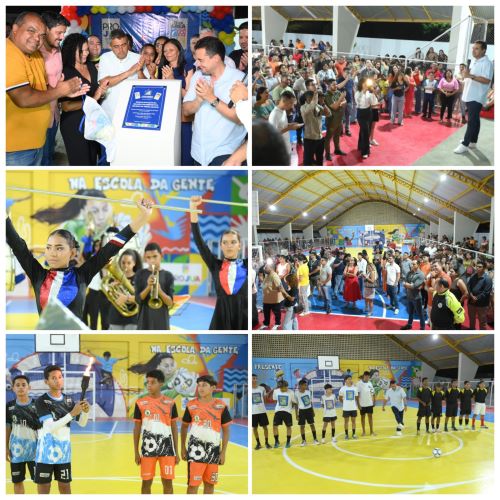 A comunidade do bairro Tabuleiro celebrou, nesta sexta-feira (19), a inauguração da requalificação da quadra poliesportiva Heleno de Jesus Araújo, localizada na Escola Municipal Terezinha Ferreira de Oliveira. O espaço foi completamente revitalizado e entregue em uma solenidade que reuniu o prefeito Andrei Gonçalves, o vice-prefeito Tiano Félix, a secretária de Educação Maéve Melo, os deputados estaduais Zó e Roberto Carlos, vereadores, secretários municipais, além de alunos, professores, pais e moradores do bairro.