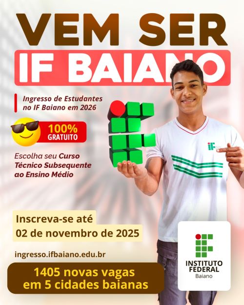 O Instituto Federal Baiano (IF Baiano) ampliou sua oferta de vagas para o Ingresso de Estudantes 2026. Foi anunciada a abertura de mais 1.405 vagas para cursos técnicos da forma subsequente ao Ensino Médio, nas modalidades presencial e EaD (Educação a Distância), em cinco unidades: Alagoinhas, Bom Jesus da Lapa, Teixeira de Freitas, Valença e Xique-Xique.