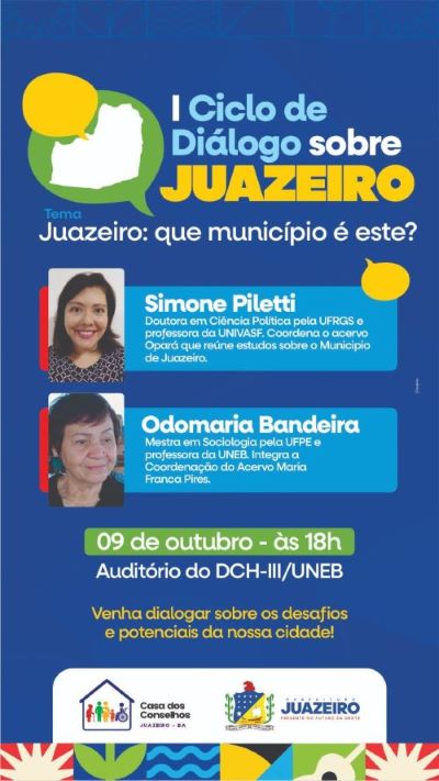 Na próxima semana, Juazeiro será palco de um importante espaço de debate e reflexão sobre sua identidade e desafios locais. A Prefeitura, por meio da Casa dos Conselhos, convida toda a população para participar do I Ciclo de Diálogo sobre Juazeiro, que será realizado no dia 9 de outubro, às 18h, no Auditório do DCH-III da UNEB. O encontro terá como tema “Juazeiro: que município é este?” e pretende reunir cidadãos em um momento de trocas de ideias e construção coletiva de entendimentos sobre a cidade.