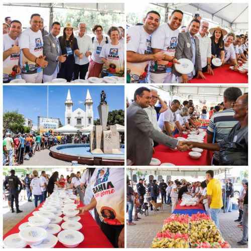 No início da tarde, o prefeito Andrei Gonçalves, acompanhado do vice-prefeito Tiano Félix, da secretária nacional de Segurança Alimentar e Nutricional, Lilian Rahal, do coordenador geral do Bahia Sem Fome, Tiago Pereira, da coordenadora do Juazeiro Sem Fome, Lorena Pesqueira, da primeira-dama do Estado, Tatiana Velloso e do secretário de Desenvolvimento Social, Igor da Silva participou da entrega de refeições com produtos da agricultura familiar, para pessoas em situação de vulnerabilidade social, na Praça da Catedral, no centro da cidade.
