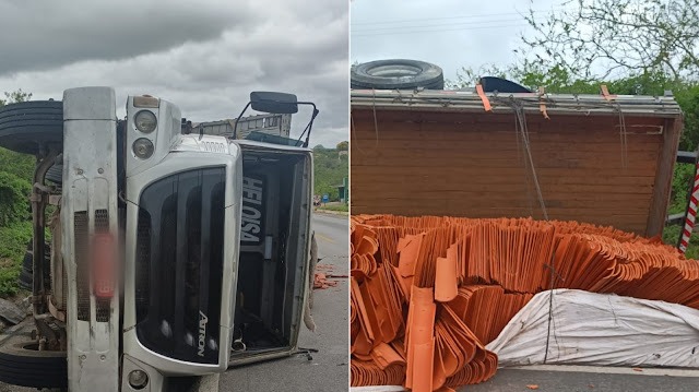 Um caminhão carregado com telhas de cerâmica tombou na madrugada desta sexta-feira (14/11), na BR 407, proximidades do povoado de Várzea Grande, zona rural de Jaguarari. O acidente teria ocorrido após falha nos freios do veículo de carga.