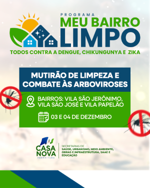 A Prefeitura de Casa Nova realiza, nos dias 03 e 04 de dezembro, mais uma etapa do programa Meu Bairro Limpo, que desta vez contemplará os bairros Vila São Jerônimo, Vila São José e Vila Papelão. A iniciativa leva ao município um grande mutirão de cuidados urbanos e prevenção às arboviroses.
