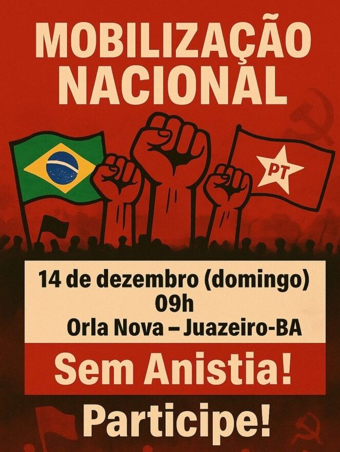 Juazeiro (BA) recebe, neste domingo, 14 de dezembro, uma Mobilização Nacional marcada para as 9h, na Orla Nova. O ato integra uma série de manifestações que ocorrem em diferentes cidades do país.