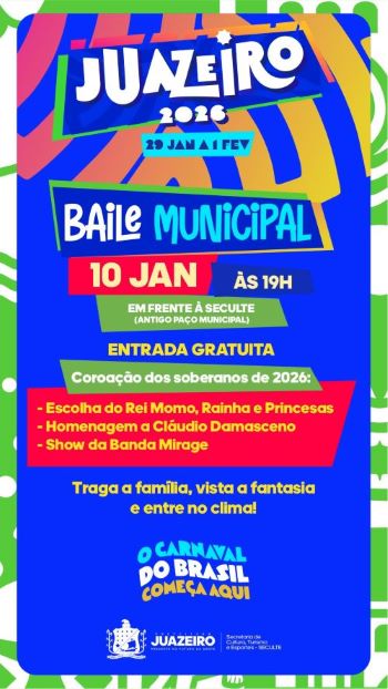 A Prefeitura de Juazeiro, por meio da Seculte, ressalta que o Baile Municipal é mais do que uma escolha de soberanos: é o ponto de partida de uma grande festa que movimenta cultura, turismo e identidade. “Estamos preparando um Carnaval que respeita nossas tradições e, ao mesmo tempo, traz novidades, organização e alegria para todos. O Baile Municipal simboliza esse início. É o momento em que a cidade se encontra para celebrar o que somos”, destacou o secretário de Cultura, Turismo e Esportes, Targino Gondim.