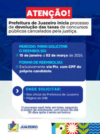 A Prefeitura de Juazeiro, em cumprimento ao acordo firmado com o Ministério Público do Estado da Bahia, MP-BA, com o Instituto de Desenvolvimento Institucional Brasileiro/IDIB e com o Serviço de Água e Saneamento Ambiental/SAAE, dará início, a partir desta quinta-feira (15), ao processo de devolução das taxas de inscrição referentes aos concursos públicos municipais regidos pelos editais nº 001/2024, 002/2024 e 003/2024, bem como ao concurso do SAAE, edital nº 001/2024, abertos pela gestão passada e cancelados por determinação da Justiça.