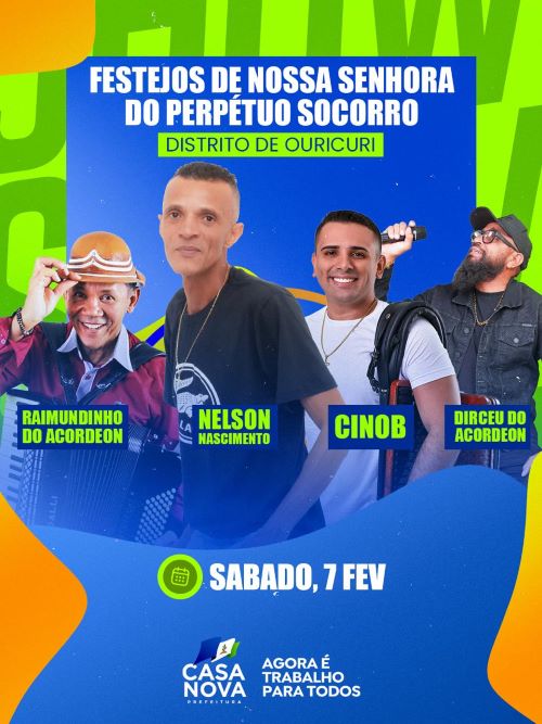 A Prefeitura de Casa Nova, por meio da Secretaria Municipal de Cultura, realiza no próximo sábado, 7 de fevereiro, os Festejos de Nossa Senhora do Perpétuo Socorro, no Distrito de Ouricuri, celebrando a fé, a tradição e a cultura popular da comunidade.
