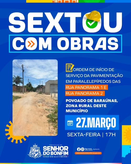 A Prefeitura de Senhor do Bonfim realiza nesta sexta-feira (27), às 17h, mais uma edição do programa Sextou com Obras, desta vez no povoado de Baraúnas, onde o prefeito Laércio Júnior assina a ordem de serviço para o início da pavimentação das ruas Panorama 1 e Panorama 2.